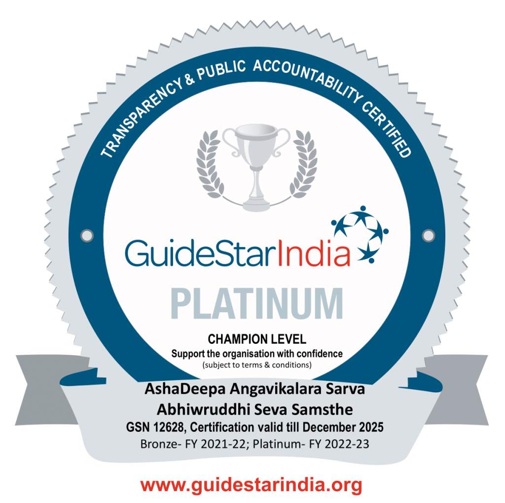 Ashadeepa nonprofit organization empower persons with disabilities, women and children promoting and facilitating environment for children with disabilities, day cares for children of working women, school readiness with therapeutic interventions for special needs children, early intervention with option of community-based interventions, enable employment skills for youth to lead sustainable life, entrepreneurship development activities for women to engage in self income generation activities, solving dowry and domestic issues with legal aid support and Navajeevana Old Age home for aged and neglected women.